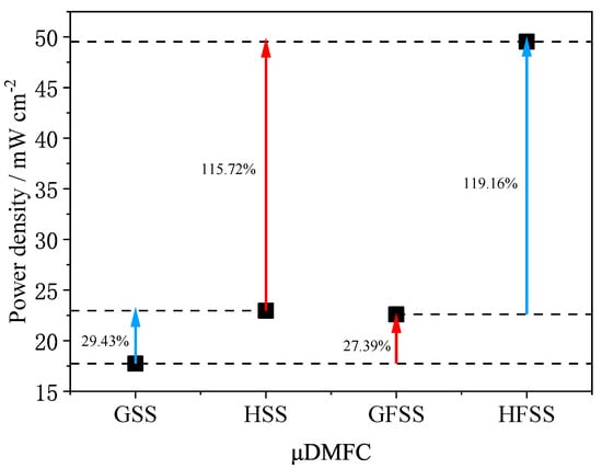 Moreover, the maximum power density of the DMFC was greater with an FSS cathode current collector compared to the one with a SS cathode current collector. The three-dimensional porous structure of the FSS provides more oxygen transfer channels, allowing air to enter the MEA through the micro-pores in the material structure. It thus improves the efficiency of oxygen transfer to the cathode and results in a more uniform reaction zone when the FSS is used as a cathode manifold. The reaction area of the cathode is increased, resulting in a faster reduction reaction rate on the cathode.