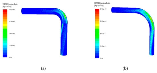 As shown in Figure 5a,b and Figure 7a,b, with the increase of bend radius, the bending path becomes longer and the erosion area becomes larger but the erosion degree is weakened. When the bend radius is 3D, the particles collide with the wall twice at the bend, resulting in a larger erosion area; while the bend radius is 1.5D, the particles collide with the wall more intensively, so the erosion area is more concentrated. As the curvature radius of the 1.5D bend is smaller, the particles change direction faster when passing through the bend, while the particles change speed more smoothly when passing through the 3D bend. Therefore, the maximum erosion rate of the 1.5D bend is larger than that of 3D bend, while the erosion of the 3D bend affects a wider area.