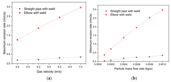 Maximum erosion rate. (a) Particle mass flow rate 0.001 kg/s; (b) Gas velocity 7 m/s.