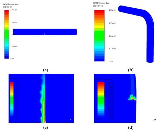 The erosion rate in this paper refers to the mass of the inner wall of the pipeline that is eroded away by particles per unit area per unit time. In order to facilitate on-site application, the result based on Equation (10) is converted into the annual erosion depth mm/a at the most severe point of the pipe wall erosion. The erosion degree of different areas in the pipeline is different, and the maximum erosion rate refers to the erosion rate of the most serious position. The material erosion perforation often occurs at the point of the most serious erosion, so the maximum erosion rate can better characterize the risk degree than the total amount of erosion.