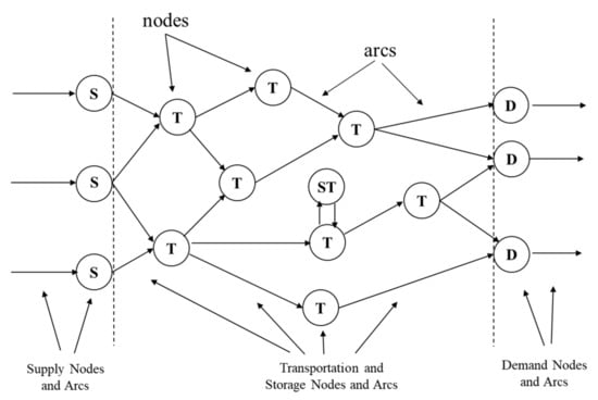 G2M2® is designed as a network model, which is possibly the most important of the special structures in linear programming. Figure 1 presents a common scenario of a network-flow problem arising in industrial logistics concerns the distribution of a single homogeneous product from the supply (origins) to demand, such as consumer markets (destinations). The product need not be sent directly from source to destination but may be routed through intermediary points with further capacity restrictions that limit some of the transportation links. The objective is to minimize the variable cost of producing and shipping the products to meet consumer demand. The sources, destinations, and intermediate points are collectively called nodes of the network, and the transportation links connecting nodes are termed arcs. In reality, the model often represents a continuous market through time, with storage being one important infrastructure feature that can link a node from one period to the next, This is essentially the same idea as a network, except in a different dimension, as in Figure 2 Natural gas underground storage is modeled as a link between periods of the network model in G2M2®.