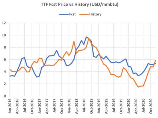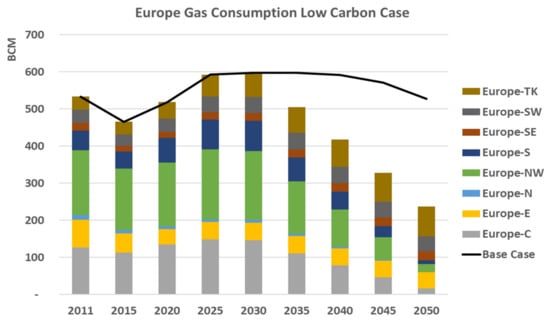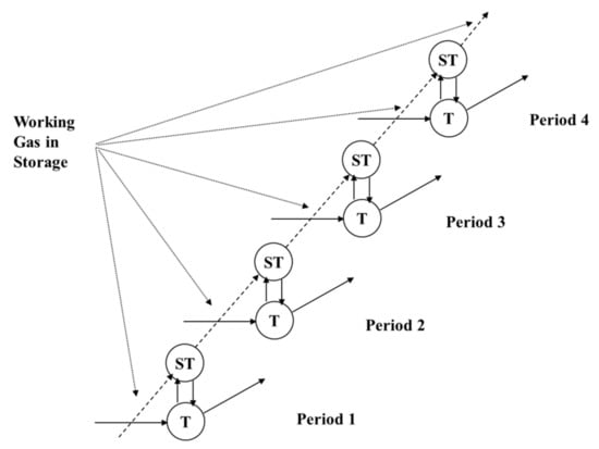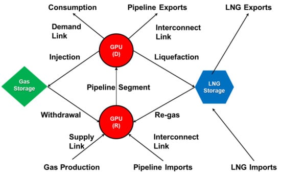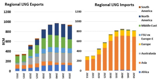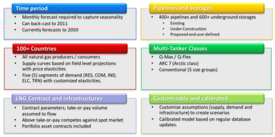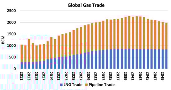 There are also a few market-forecasting models for the natural gas market with different regional focuses and several decades of experience and practice. Busch [] has reviewed a list of eight natural gas market models in order to compare and redesign the internal natural gas transmission and distribution module (NGTDM), for the Energy Information Agency (EIA) of the United States. One of the key intentions of the NGTDM’s redesign effort is to accommodate market changes that are not necessarily tied to the previous year’s numbers. This is where structural models such as LP/NLP and an agent-based model bring positive improvement, albeit in many cases at the cost of computation and complexity. This report includes several LP and agent-based models that cover either the North American market or the world gas market. Goryachev [] provides a detailed review of world gas models, after the EIA’s review, including the Nexant World Gas Model, the University of Maryland World Gas Model, the Rice World Gas Trade Model, and the Deloitte MarketPoint World Gas Model. The selection of models considers the depth and detailed elaboration of the original data, the breadth of their geographical coverage, and the uniqueness of the applied algorithm. One interesting point made in this study in the comparison of the models is about the trade-off of behavioral strategies at the agent level versus the elaboration of details for linear models versus nonlinear models. Behavioral changes and strategies can only be analyzed in running exogenously assigned scenarios. Conversely, nonlinear models allow behavioral changes as defined through optimization functions at the individual level.