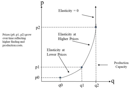 There is a supply curve for each period that crosses different prices, such as what is shown in Figure 5, where only quantity and prices are graphed but not time. If one takes the family of supply curves across a time period and then graphs the supply quantity along the curves at a given price path, we are given supply curves over time at a given price scenario. This is shown in Figure 6 in three price scenarios: low, medium, and high. Here, when limited to a two-dimensional graph, one can only see time and quantity.