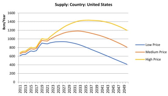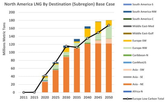 Besides discussing the methodology of the structural approach, several research studies also bring the theory and model to address meaningful and timely matters and trends in the market. Egging et al. [] used a partial equiliburm model Global Gas Model (GGM) to investigate the prospects for U.S. LNG to European energy market. NERA Economic Consulting [] published a study focusing on a wide range of scenarios of future U.S. LNG exports, assessing the likelihood of different levels of unconstrained LNG exports from 2020 to 2040, using NERA’s Global Natural Gas Model (GNGM). Possible future export levels in the scenarios evaluated include very unlikely extreme cases, and the study focused on measuring the impacts of these scenarios based on macroeconomic metrics for the U.S. economy. Richter and Holz [] have also utilized the Global Gas Model to examine the energy security in Europe with regard to various gas export disruption scenarios from Russia. Kotek et al. [] also compared results from three models from different institutions and evaluated European gas infrastructure development over the period 2015–2050 with the same input data.
