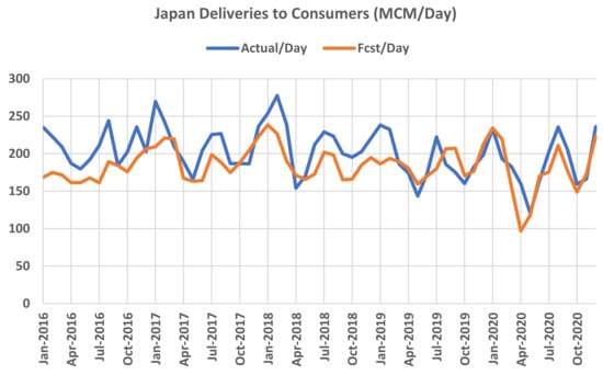 Calibrated gas deliveries versus historical consumption—Japan (unit: million cubic meters per day).