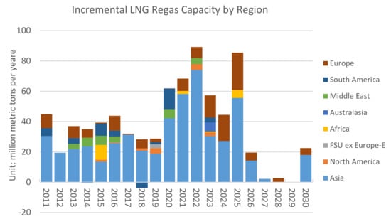 The first body of literature is on LNG market development. The importance of the natural gas trade has been recognized and demonstrated by many publications and research works, such as the 2018 Energy Statistical Yearbook by United Nations [], and BP statistical review of world energy []. The LNG trade is the fastest-growing sector in the natural gas trade, integrates geographically dispersed gas markets, and attracts a great deal of attention from industry and researchers in response to strong regional growth, especially in Asia [,]. The liberalization of natural gas and LNG commodities has accelerated the progression to a more competitive market structure at a global level [,,], with a statistically validated integeration among Europe, East Asia and North America markets []. LNG markets are becoming more competitive compared to the traditional LNG regime of bilateral and long-term contracts with destination restrictions and oil-linked prices []. Chen et al. [] found that the consumption competitiveness of LNG significantly improved between 2008 and 2015. As the market evolution has been recognized by researchers, there is more interest in how LNG trade could impact the rest of the natural gas market. Geng et al. [] argued that the network of LNG-trading countries is more closely linked relative to the network of pipeline gas trading countries. Barnes and Bosworth [] used a gravity model and found evidence supporting the deregionalization of the total natural gas market because of the development of the LNG trade. Recently, Zhang et al. [] employed a gravity model to identify the determinants of the development of LNG trade flows, namely, economics, supply and demand, price, energy structure, trade feasibility, and politics. International Gas Union [] found evidence that LNG short-term trading has been increasing globally in the past decade, and Asia is likely to remain dominant in the global LNG trade. Most LNG market development research has highlighted the important trend emerging in the marketplace without being able to explicitly illustrate its long-term impact on the future.