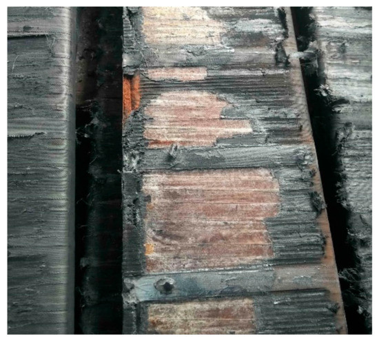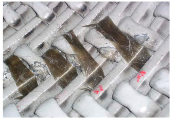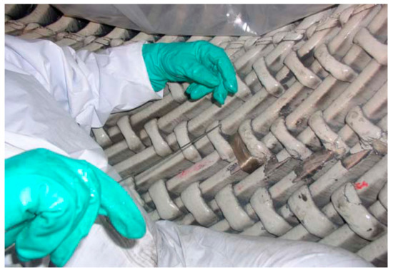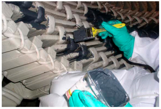 Figure 1 shows a serious degradation of the insulation system of the stator bars due to mechanical and electrical stresses, both of which were caused by PDs that occurred during the EM operation time. Τhe results of inspections and tests showed that the loosening of bars inside the slot is still at an initial stage except for some weak bars located in the bottom area of the stator core already at a critical stage. Given the above circumstances, preventative and/or corrective maintenance actions were performed in order to prevent the worsening of the EM condition. The standard conductive resin injection was chosen in order to tighten the bars inside their slots, to restore a proper contact between the insulation surface and core slot walls, and to inhibit further mechanical erosion and PD activity. These actions are shown in Figure 2, Figure 3 and Figure 4. It must be noted that Figure 1, Figure 2, Figure 3 and Figure 4 were captured during real on-site maintenance actions on the aforementioned SG.