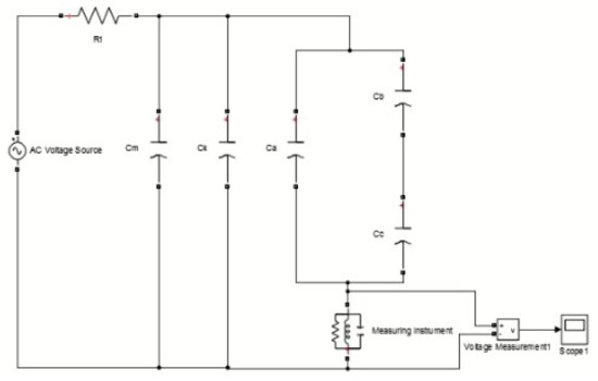 The PD model chosen is the capacitive model, a widely known and accepted model for PD studies in solid insulation materials. This model, referred to as the conventional method for detecting PD, is capable of describing mainly internal discharges, surface discharges as well as corona discharges. The capacitive model is an approximative representation of what happens inside an enclosed cavity. The classical capacitance model consists of three capacitors, which indicate the test object (: Capacitance of the void in the solid material, : Capacitance of the insulation material connected to the void, : Capacitance of the remaining insulation material). The MATLAB/Simulink model (IEC 60270 Standard), which was created in order to simulate the PD, is shown in Figure 8. The circuit consists of [27,28,29,30,31]: