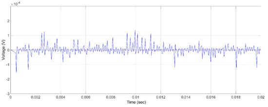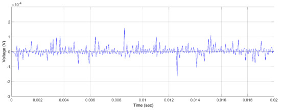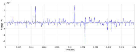 The applied voltages, used for the simulations, were the same as the voltages used in the PD measurements of the SG, described below. PD characteristics do not appear for a long time period and that is why the simulation time was chosen to be 0.02 s. Some results of the simulations are shown in the next figures. Figure 9, Figure 10 and Figure 11 show the resulting PDs at 5 kV, 10 kV, and 15 kV respectively. PDs are shown as spikes in these figures. More specifically, in Figure 9, the most important spikes are at 0.015 s, 0.017 s, and 0.019 s, in Figure 10, the spikes are at 0.0005 s and 0.017 s, and in Figure 11, the spikes are at 0.005 s, 0.011 s, 0.0125 s, and 0.0165 s. It is obvious, that while increasing the applied voltage, both the number and the amplitude of the PD increase.