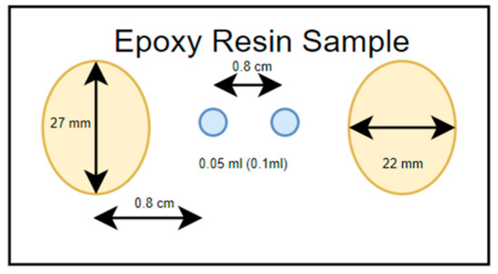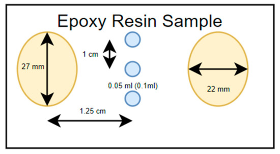 Eight different water droplet setups were chosen (Figure 18, Figure 19, Figure 20 and Figure 21), which one by one, were positioned on the sample surface of the epoxy resin. Eight different water conductivies were used, from 1.4 μS/cm to 10,000 μS/cm, in order to investigate how they affect the PD. The experiment procedure was analyzed in-depth in previous work [42]:
