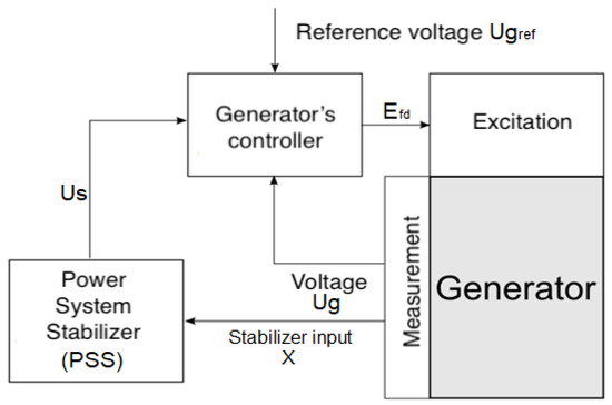 The classical control system of the generator consists of an excitation controller, which changes the excitation voltage that keeps the value of the voltage of the generator on a set value. There is also the power system stabilizer (PSS) in the considered control system which, on the basis of the information concerning the active power (), corrects the set point value (reference voltage ) fed to the generator’s controller, in order to eliminate the oscillations in the active power delivered to the power system, as a result of the operation of the excitation controller (see Figure 1).