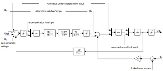 The proposed new solution must cooperate with the existing structure and must both cooperate with the existing structure and ensure an equally high level of safety. Apart from the generator itself, the classical structure of generator control system (Figure 4) consists of the excitation and excitation control system, and the system stabilizer discussed in the article, as well as a whole series of limiters and protections. This structure is designed to maintain the generator voltage set point, while ensuring the plant’s operational safety and in such a way that it can replace classical solutions in accordance with the existing elements of the power system control. In order to be able to easily change the existing solutions to the proposed solutions, an identical structure of the control system with an excitation controller and an additional signal from the plant was adopted; see Figure 1. Thanks to this, the proposed solution uses exactly the same connections, and only the internal implementation differs from classical solutions using different control algorithms, see Figure 5.