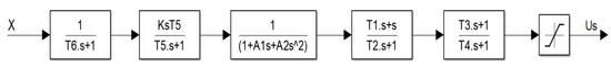 Additionally, apart from the relationship between the excitation voltage and the generator voltage , there is a relationship between the rotational speed in and the voltage in the plant. This means that all rotational speed disturbances have an influence on the voltage value and must be compensated by an appropriate variation in the excitation voltage. Thanks to the additional information about the change in rotational speed, it is possible to better react to these changes. Due to the fact that the rotational speed is equal to the rotational speed of the turbine (common shaft) and, at the same time, also translates into the power transferred to the power system, it is possible to use a number of other substitute signals, i.e., active power of the generator, voltage frequency, or a change in the turbine power (e.g., opening angle of the control valve).