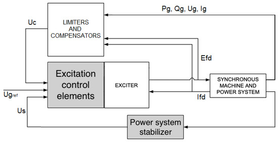 Standard synchronous generator control structure [14]. Considered parts of the system marked in gray (the controller and the power system stabilizer).