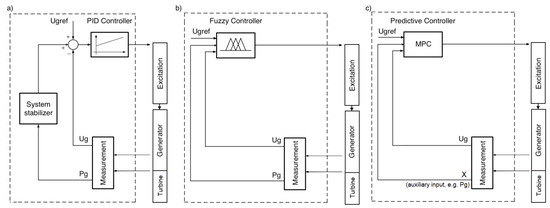 Generator’s control structures: (a) classic structure, (b) fuzzy logic controller, (c) model predictive controller.