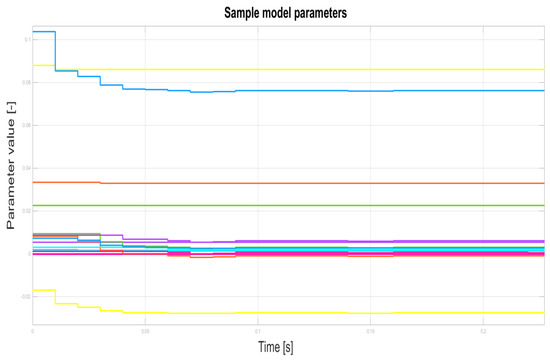 The last stage of the identification process is verification, which, in this case, consists of comparing the responses of the model and the object to the same input signal. On this basis, the estimation error is calculated, which is a measure of the accuracy of mapping the real object by the mathematical model. The model can be considered as representing the reality well if the obtained error is equal to zero or falls within the accepted error limits (if, for example, due to the structure not corresponding to the structure of the object, it is not possible to achieve zero error). The verification of the operation of the implemented RLS algorithm is presented in References [33,37,44], and a sample set of estimated parameters is presented in Figure 6.