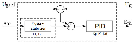 This solution will be compared to the solution with a simple PID controller, including a standard stabilizing unit in a power system (Figure 8), which is a simplification of a commonly used standard (implemented as an integral-derivative block). It is to be stressed that, despite the prior selection of a PID structure, the superior results have been obtained for no derivative action. In order not to narrow the scope of the discussion, the PID reference in the figures has been left. The proposed solution will be eventually compared with the solution in the form of a simple PID-driven system, including a standard stabilizing unit in a PSS; see Figure 8. For the system presented in this figure, the considered PID controller is fed with the generator’s voltage error and updated with the action exerted by a system stabilizer. There are many different structures of system stabilizers with different parameters [48]. Each of them can give different results and a different quality of control. Nevertheless, one of the simplified control systems was adopted so that it could constitute a comparative background for the proposed solutions.