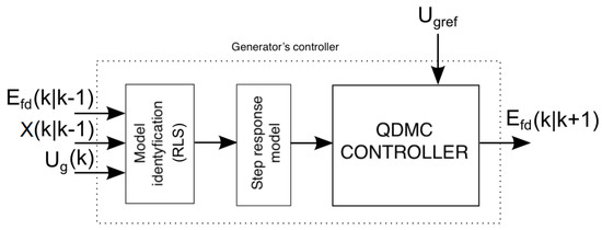Typical generator control system was described in Section 3.1. In this paper, instead of typical integral-derivative blocks of the controller, the Quadratic Dynamic Matrix Control (QDMC) variant of an MPC controller for the purpose of control of a synchronous generator is suggested [45]. In order to obtain an improved quality in the closed loop system, i.e., the quality in a control loop binding the turbo-generator, one needs to introduce, to some extent, that exchange of information between the quadratic dynamic matrix controller and the environment form an additional signal, i.e., rotational speed , active power , or steam turbine’s control valve opening degree . Furthermore, to cope with constantly changing operation point (the specific state of the facility in which it is located during operation) of the system, model adaptation using recursive least squares (RLS) algorithm is proposed.