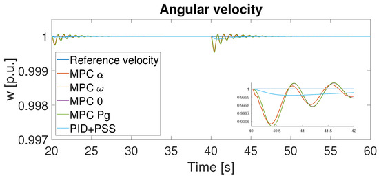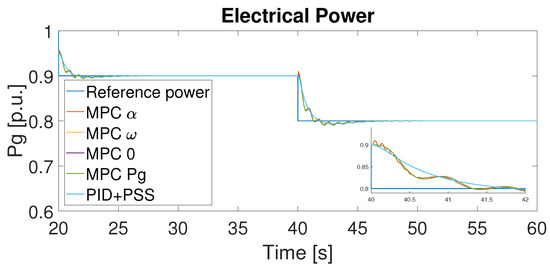 The test experiment consisted in a step change of the active power set point value by 10% every 20 s of the simulation. There are restrictions on control signals . Figure 11, Figure 12, Figure 13 and Figure 14 and Table 6 present the results of the simulation tests. A detailed description of the experiment can be found in Reference [37]. According in Reference [57], p. 23, Table 4, which defines parameters for active power frequency response, the admissible dead-zone secures the case of neglectful oscillations visible in the figures. Besides, the amplitude of oscillations virtually vanishes for the un-zoomed case of the plot.