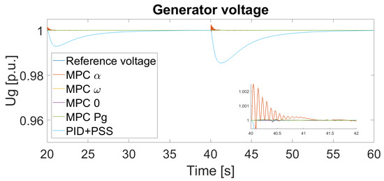 Standard generator control systems consist of an excitation controller constituting a series of lead-lag blocks, an additional system stabilizer module and a number of limiters and safety systems [14]. The system stabilizer is a supplementary system that implements an additional feedback loop to ensure more effective damping of voltage oscillations appearing in the power system. These circuits typically consist of one or more lead-lag tracks and may use different input signals, e.g., shaft speed, terminal frequency, and power [14]. In the paper, the authors consider the use of a Model Predictive Controller (MPC) in the voltage regulation task of a synchronous generator. The proposed solutions are aimed at stabilizing the voltage and minimizing its oscillations. Due to the existing relationship between the frequency of the voltage and its amplitude, these goals are contradictory. The faster the controller reacts to voltage changes and the faster it stabilizes them, the greater the oscillations become. Therefore, an attempt was made to expand the MPC solution with additional signals to diminish this phenomenon. In classic generator control systems, an additional system stabilizer system is used for this purpose. In order to avoid the introduction of an additional circuit, a similar effect is obtained by using the additional power system stabilizer, and, to take full advantage of the advanced model-based control method, it was decided to feed the MPC controller with an additional auxiliary signal. This allows, as in the case of the proportional integral derivative controller (PID) plus Power System Stabilizer system, to take into account the information about the influence of the control signal on the formation of oscillations. As in the case of classic system stabilizers, the addition of an extra feedback loop should reduce the occurrence of a negative oscillation phenomenon.