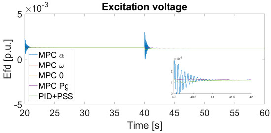 Despite the fact that MPC control has become a standard method, it is not used in a larger scale in the power industry and in power plants control systems [46]. Changing the standard solution based on PID control allows one to take into account the knowledge of the plant during the control process and, thus, to efficiently optimize this process. One of the main advantages on the MPC-based solution is the possibility of taking all the plant-related constraints into account [47]. In addition, the operation of the MPC controller can be influenced by selecting appropriate parameters, i.e., control horizon, prediction horizon, or sampling period. Thanks to this, the behavior of the controller can be shaped in such a way as to best suit the requirements, e.g., quick control or smooth control without oscillations. As part of the research, the requirements for the excitation control system were analyzed, and the impact of changing the controller parameters on meeting these requirements was verified. The obtained results are presented in the article.