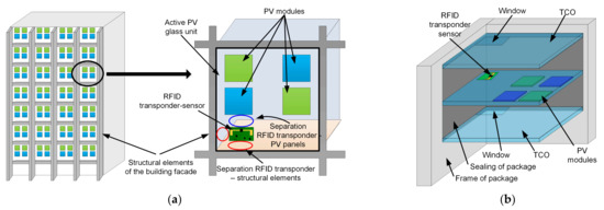 Active glazing unit in modern multi-storey buildings: (a) Spatial separation between RFID sensor and construction elements; (b) Idea of using window in the TCO or heating layer for delivering system electromagnetic field to antenna of RFID sensor.
