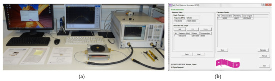 The dielectric parameter determination was carried out in a specialized laboratory stand (Figure 2). Measurements were made at the frequency of 1.1 GHz (close to the selected UHF band of the RFID system) using a split-post dielectric resonator (SPDR by QWED Sp. z o.o., Warsaw, Poland)) and a vector network analyzer Keysight PNA-X N5242A (Keysight, Santa Rosa, CA, USA). In addition, a set of special cables was used, such as the flexible Keysight 85131F cable set and the Huber + Suhner Minibend cable assembly. The measuring algorithm included a stand calibration procedure, determination of the resonance frequency and of the quality factor of the dielectric stack arrangement for the test sample. The required parameters of the measured dielectric layer were determined using the dedicated QWED software based on a mathematical model of the SPDR [26].
