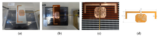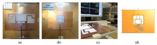 The investigations were performed for two antenna patterns designed for fabricating on the FR408 substrate (Figure 14c,d). The first design (Figure 14c) was elaborated as the meandered dipole with an impedance match circuit in the form of a loop. Since the chip’s input is short-circuited by the matching loop, the DC block had to be used, and pads for its connection had to be added in the numerical model. The second construction was a dipole with bent arms (Figure 14d). In this case, the impedance matching was achieved by use of an SMD coil attached to one of the antenna arms.