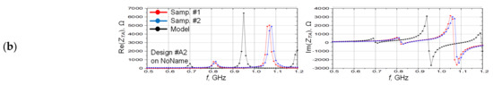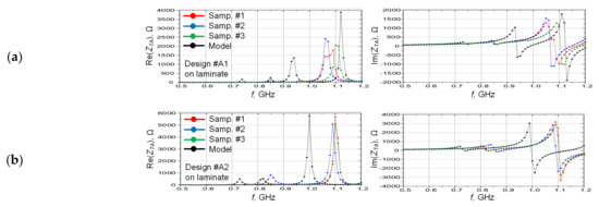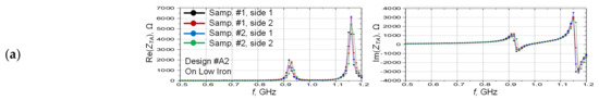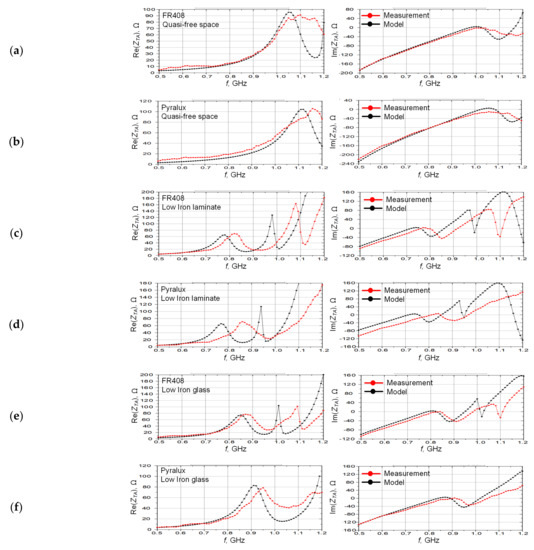 In the case of using the low-iron laminate, the impedance curves had the same shape but the measurement results for both the FR408 (Figure 4c) and Pyralux (Figure 4d) were shifted by approximately 50 MHz. It should be emphasised that the discrepancies are mainly visible as the shift of the curves in the frequency domain with almost the same shape of the curves, which would suggest incorrect determination of the dielectric parameters of the low-iron laminate.