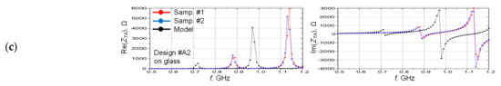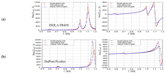 In the case of low-iron glass (for FR408: Figure 4e, Pyralux: Figure 4f), the shift was noticeable especially at higher frequencies. It is worth noting, however, that close to the frequency range used by RFID systems in Europe, the differences in the impedance values for the numerical model and the samples can be considered negligibly small. This applies to the reactance, the values of which were similar for the model and the tested samples.