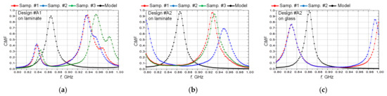 The examined samples were modelled and manufactured on the FR408 laminate. The comparison of measurements obtained for the samples on the low-iron laminate with the model calculations of the antennas #A1 and #A2 is shown in Figure 6a,b. Although the curves in the graphs have a similar shape, the reference and measured data were significantly shifted in relation to each other in the frequency domain (by approx. 80 MHz and 100 MHz, respectively). Such discrepancies exclude the possibility of correct and effective operation of the so designed antenna in the RFID system. Replacing the low-iron laminate by low-iron glass (Figure 6c) lead to a similar discrepancy.