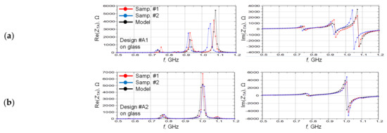 Impedance of RFID antenna: (a) #A1; (b) #A2. Thin layer of air (0.4 mm) between the FR408 laminate and the glass surface is included.