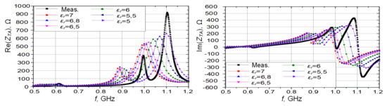 It was concluded, on the basis of the performed investigations, that the problem with the curves’ convergence lies in the validity of the antenna model. First of all, attention was paid to the correctness of modelling the arrangement of two dielectric materials in the stacks under consideration: glass and microwave laminate. Since the dielectric constant εr is the key parameter that influences the ZTA impedance, it is necessary to pay attention to the accuracy of determining its total value for the stack consisting of two layers—a detailed description of the problem can be found in publication [28] that is cited in most recent studies. It is unfortunate, but generally a consideration of this problem is omitted from software manuals dealing with the numerical calculations [29].