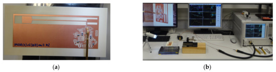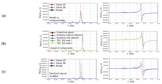 However, it should be noted that the proposed design is a monopole construction, so it may be sensitive to even slight changes in geometric dimensions (e.g., inaccurate sample preparation). For example, Figure 13c shows the measurement and calculation result discrepancy after modifying the layout of the electronic circuit by adding contact pads and making small changes to the ground layer.
