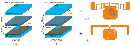 In the case of glazing units, the characteristics were based on representative glass samples with a size of 15 × 15 cm taken from products available on the commercial market. Due to the lack of precise information on the dielectric parameters [25], extensive research needed to be carried out in terms of the impact of the glass on the design of the RFID sensor antenna circuit (Table 1).