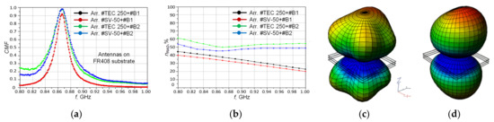 Parameters of RFID antennas: (a) CMF; (b) Radiation efficiency nRAD; (c) Radiation pattern (f0 = 866 MHz) of antenna #B2 in the arrangement of #SV-50; (d) Radiation pattern (f0 = 866 MHz) of antenna #B2 in the arrangement of #TEC 250. The radiation pattern of antenna #B1 is very similar.