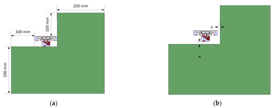 As assumed in Section 3.1.1, the RFID antennas can only operate properly if a sufficiently large opening is created in the thin functional layers. Therefore, the influence of the functional layers’ proximity on the impedance parameters and propagation properties of the antennas #B1 and #B2 was examined in detail. The dielectric parameters of microwave FR408 laminate and a glass made of NSG TEC 250 or Stopray Vision-50, as well as the 500 nm thick TCO layer (green in Figure 16), were taken into consideration in the numerical model (Figure 16). A separation of 100 mm was assumed as the initial value of the distance between the antenna and the unit frame (Figure 16a). In the next steps of the calculations, the distance between the antenna and the TCO layer was increased equally on each side of the radiator (Figure 16b).