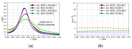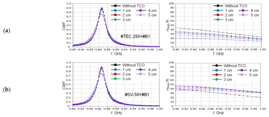 CMF and radiation efficiency nRAD when modelling with TCO or Cu layer: (a) Slot antenna #C1; (b) Monopole antenna #C2.