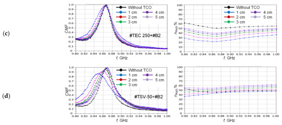 CMF and radiation efficiency nRAD vs. separation distance between TCO and antenna radiator in arrangements: (a) #TEC 250+#B1; (b) #SV-50+#B1; (c) #TEC 250+#B2; (d) #SV-50+#B2.