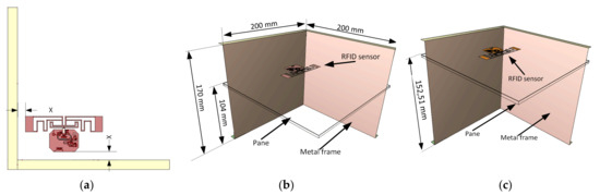 The possibility of establishing radio communication from both sides of the active glazing unit (from inside and outside of the building) was one of the first concepts considered for the investigations into the synthesis of RFID antennas. With respect to the principles of RFID system operation, the TCO, or heating thin layer, has to be treated as the reflector or attenuator of electromagnetic waves. If such a layer is applied on the glass pane, in most cases it blocks the possibility of connecting the RFID sensor with the RWD. In order to solve the problem, it was proposed to remove (e.g., by laser ablation or mechanical grinding) the functional layer from a fragment of surface to create a window for passing electromagnetic signals. The geometric dimensions of the opening were assumed to be so large that the impact of the thin layer on the impedance parameters and propagation properties of the antenna system was considered as negligible in the research undertaken. The hypothetical location of the RFID sensor in relation to the structural frame of the glazing unit was also considered. According to functionality and the aesthetic requirements of the application, the best place for fixing the device was the corner but with sufficient distance from any metal elements (Section 3.2). Finally, the full triple-glazed unit, with the opening in the thin layer (Figure 14a,b), was implemented in the numerical model. The thin separation between the glass and antenna substrate was included in the calculation. It was assumed that the central pane was made of 1.92 mm thick low-iron glass, and that the inner and outer panes were made of Stopray Vision-50 or NSG TEC 250 glass (Table 1).