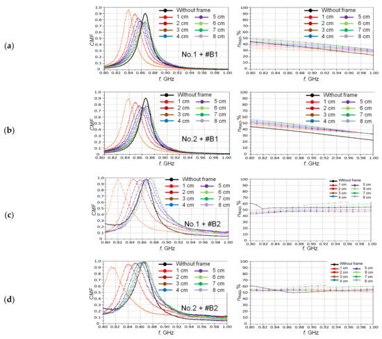 The antenna #B1 was less susceptible to the influence of the functional layer. The maximal value of the CMF was noticeably smaller for a separation below 2 cm, and shifted in the frequency domain. The type of used glass had little effect as shown in Figure 17—it can be seen, in particular, in the arrangement with the antenna #B2. As a result, the calculations performed confirmed the validity of the assumptions made in Section 3.1.1.