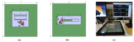 Consideration of the use of RFID antennas, optimized for use on glass substrates, typically automotive glazing, can be found in the relevant literature [15,16,17]. These structures are usually dedicated to work in harsh environmental conditions (e.g., near metal) and are constructed as a modification of dipole antennas (with linear polarization). Other studies [18,19] have proposed designs with a different polarization, but their application in the context of the present research is not possible due to the spatial construction of their radiators. A typical problem is with the RFID chip position inside the structure of the proposed antenna circuits, which makes it impossible to feed signals to the measurement module. In [20,21], the transponder antennas have the quasi-omnidirectional radiation pattern but, in these examples, the inductive loop around the RFID chip is excessively complicated.