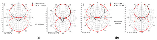 Vertical and horizontal directional diagrams (f0 = 866 MHz): (a) Slot antenna #C1; (b) Monopole antenna #C2.