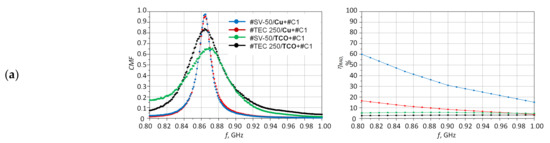 Determination of the dielectric constant for glass coated with a TCO is a big challenge, and is often subject to significant uncertainties. It is impossible to create the measurement sample with only the TCO because the properties of the thin coating and the bulk material are different. Furthermore, the calculations on the basis of formula (1) are substantially inaccurate, because of significant variations in the proportions between the thicknesses of the layers. However, the TCO influence can be checked by analyzing the convergence of measurements and calculations (Figure 10), and the proper value of εeq can be found. It should be noted, however, that full correspondence between the calculated data and the measurement results was not achieved in any of the cases considered.