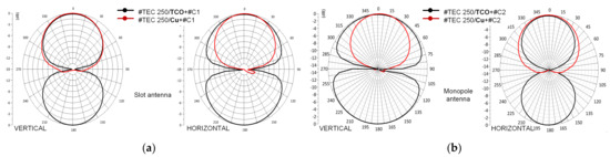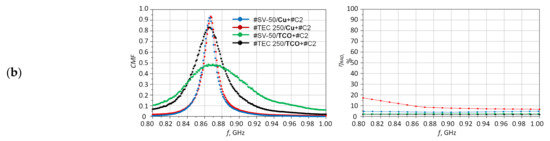 The influence of the thin functional layer can be eliminated by using a reflector inside the structure of the glazing unit (on the inner side of the pane, opposite to the antenna radiator). A conductive material, such as 18 µm thick copper plate, can be used for this purpose. In consequence, the radiation pattern becomes strongly directional and the maximum value of the power transfer coefficient was significantly increased (Figure 24), but the antenna operating bandwidth (defined for CMF in the range from 0.5 to 1) was narrowed. In addition, an improvement in the propagation properties can be observed and is manifested in particular by a significant increase in the radiation efficiency (Figure 24a). The copper layer, with better conductivity than the TCO, resulted in a further reduction of the antenna’s back radiation (Figure 25)—in the case of the SV-50 pane, the directional diagrams were almost the same for the models with the Cu and TCO component. Significant differences were visible in the model with the TEC 250 (Figure 25) because of the low conductivity of the functional layer (please compare with Figure 23). In the case of a monopole, there is no significant improvement in the radiation efficiency (Figure 24b). This is due to the fact that the open antenna is more sensitive to harsh environmental conditions than the slot antenna.