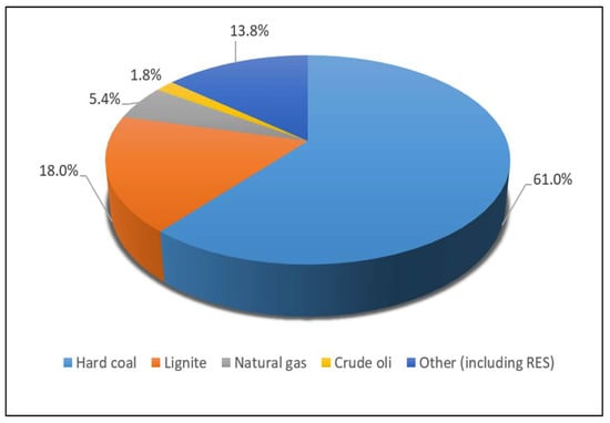 Restructuring programmes for the hard coal mining industry in Poland should relate to strategic, long-term assumptions of the national energy policy, and be based on the rational use of domestic energy resources. At present, Poland is an energy-secure country in terms of the generation of electricity and heat, in comparison to other EU countries. This security is ensured by coal, on which almost the entire power industry is based. The great significance of coal for the Polish economy results from the possession of large deposits of this raw material. Documented balance resources of hard coal deposits (as at 31 December 2020) amount to 64,422.38 million tonnes. Almost 71% of the Polish resource is thermal coal and approximately 28% is coking coal, while other types of coal constitute 1% of all coal resources. The resources of developed deposits currently account for 44.10% of the balance resources and amount to 28,409.26 million tonnes [4]. Hard coal, which is the most important energy carrier, accounts for 61% of the total energy generation. Another significant raw material is lignite with a share of 18%. Natural gas constitutes 5.4%, crude oil 1.8%, and other energy carriers, including, first of all, renewable energy sources, constitute 13.8% (Figure 1) [5].