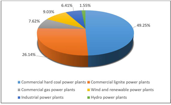 In the energy balance of Poland, RES constitute about 11%. The percentage structure of acquired electricity for individual groups of power plants by fuel type in 2019 follows: commercial hard coal power plants 49.25%, commercial lignite power plants 26.14%, commercial gas power plants 7.62%, wind and renewable power plants 9.03%, industrial power plants 6.41%, and hydro power plants 1.55% (Figure 5) [19].