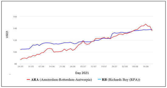 Another threat to the Polish coal industry includes competitive coal from South Africa, Australia, and Russia. Polish coal is losing out to these competitors due to the high cost of extraction compared to the price of imported coal. At present, world coal prices are approximately USD 142 per tonne, and this trend, or an upward trend, is likely to continue in the near future (Figure 6) [23]. Due to the depletion of oil and natural gas deposits and an increase in the prices of these raw materials, together with the fact that not all world economies are “moving away” from coal, it may be believed that coal’s bad streak may change.