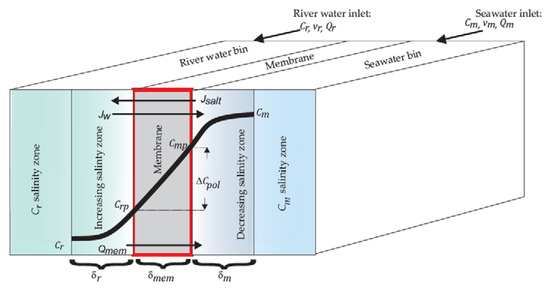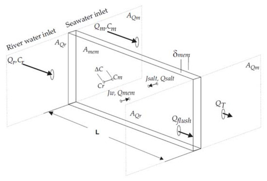 The river water and seawater pumped to the membrane module produce through the membrane surfaces the salinity gradient ΔC given by (27) (see Figure 4). This salinity gradient develops the osmotic pressure difference Δπ given by (28), where R, T, M, and im denote the universal gas constant, the solution temperature, the molar mass of the salt, and the Van’t Hoff factor, respectively. The osmotic pressure difference Δπ is higher than the opposing hydraulic pressure ΔPh imposed inside the seawater bin, hence it drives the permeation of river water to the seawater bin through the membrane area Amem. The permeate flux Jw and the flow rate Qmem of this river water transference are given by (29) and (30), respectively. In (29), A is the water permeability coefficient. The permeation of the river water at the opposing hydraulic pressure ΔPh is known as the pressure retarded osmosis mechanism [2,6].