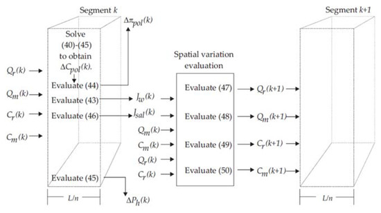 To evaluate the spatial variation phenomenon, the membrane module is partitioned into n segments of equal length Ls = L/n and the values of the variables for each segment are then computed, as detailed below. Figure 6 depicts two consecutive segments. Consider that the values of the flow rates and salinity concentrations Qj(k) and Cj(k) (for j = r,m), respectively, are known at the input of the k-th segment. Take these values to solve (40)–(45) for ΔCpol(k). Once ΔCpol(k) is obtained, the values of the osmotic pressure Δπ(k) and the permeate flux Jw(k) and Jsalt(k) at the k-th segment can be directly computed from (44), (43) and (46), respectively. Using Qj(k) and Cj(k), as well as the resulting values of Jw(k) and Jsalt(k), the flow rates and salinity concentrations Qj(k + 1) and Cj(k + 1) (for j = r,m), respectively, at the input of the (k + 1)-th segment must be evaluated from the model (47)–(50), as illustrated in Figure 6. To compute the spatial variations along the membrane length, the (k + 1)-th segment is set as the k-th segment and this process is repeated until processing the last (n-th) segment. Clearly, this procedure starts at the first segment, i.e., for k = 1, where the values of Qj(k = 1) and Cj(k = 1) are known. Note that the model (40)–(45) corresponds to the discretized form of (33)–(38). Furthermore, in (45) the value of the effective salinity gradient is fixed at the value computed at the very first segment, in order to neglect the pressure losses along the membrane module.
